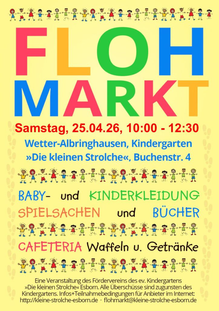 Wenn ihr Artikel anbieten möchtet, sendet bis zum 17. April 2026 eine formlose Mail an flohmarkt@kleine-strolche-esborn.de – Ihr erhaltet dann alle Infos und eine Verkäufernummer. Ohne eine solche Nummer könnt ihr auf dem Flohmarkt keine Artikel anbieten!